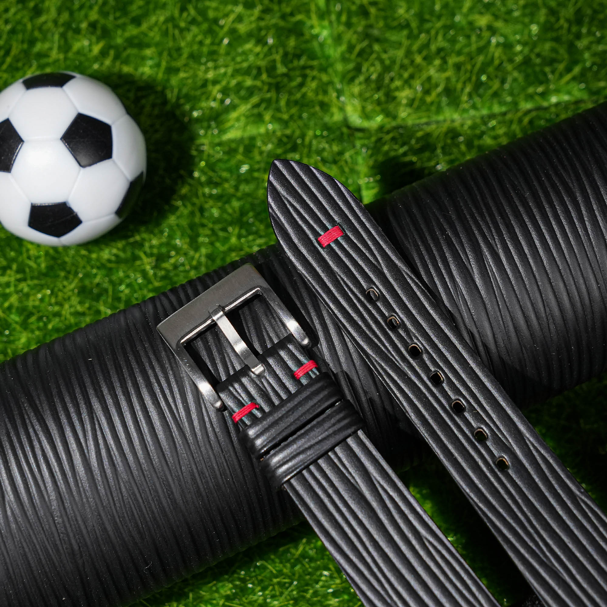 Structure of Black Calfskin Leather Romania Flag Watch Strap: Epi Leather main face (waves pattern), water-resistant and soft Zermatt specialized lining, absolute anti-irritant, Velodon specialized reinforced material (SH-220 reinforcement).