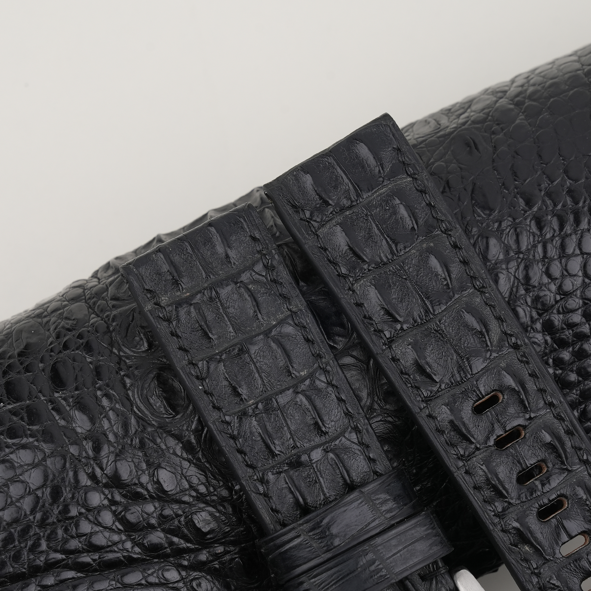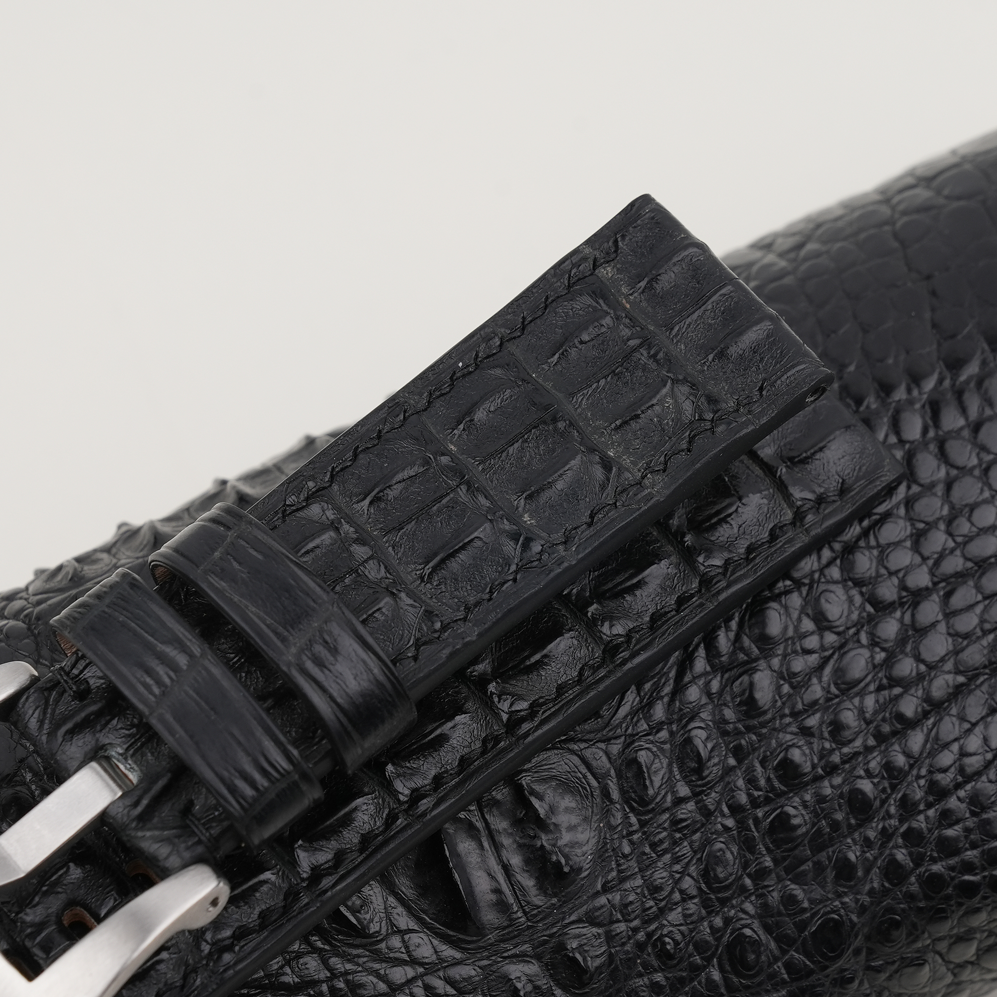 Structure of Black Double Hornback Alligator Leather Strap for PAM Watch: The HANDDN PAM watch strap uses Double Hornback Alligator leather for the main surface, Zermatt specialized secondary surface, with the interior padded with Nubuck leather and reinforced securely with Velodon Specialized Reinforced Material (SH-220 Reinforced). The edges are finely sanded and left to nature, creating a rustic, raw, and natural feel. The leather material is made from natural herbs, ensuring durability and beauty over time.