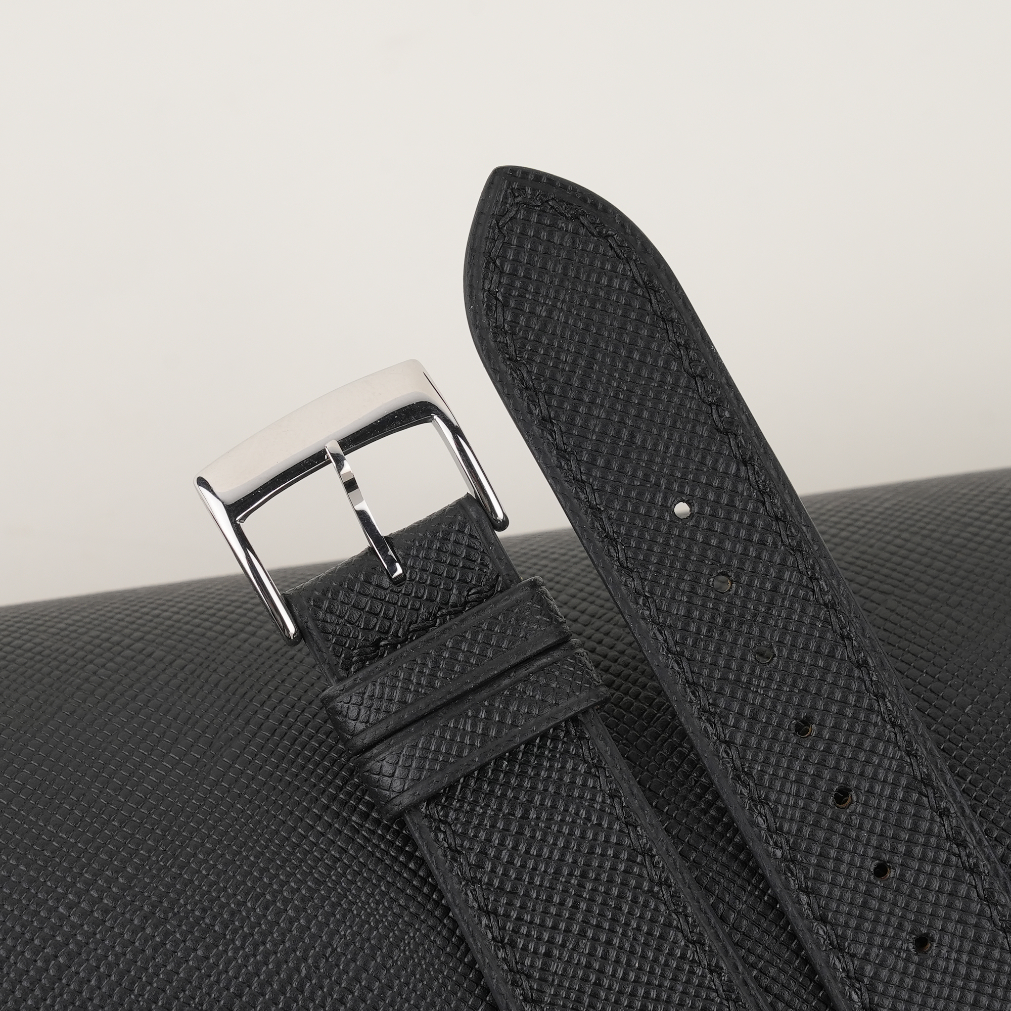 Structure of Black Saffiano Leather Watch Strap: Saffiano Leather main face, water-resistant and soft Zermatt specialized lining, absolute anti-irritant, Velodon specialized reinforced material (SH-220 reinforcement).
