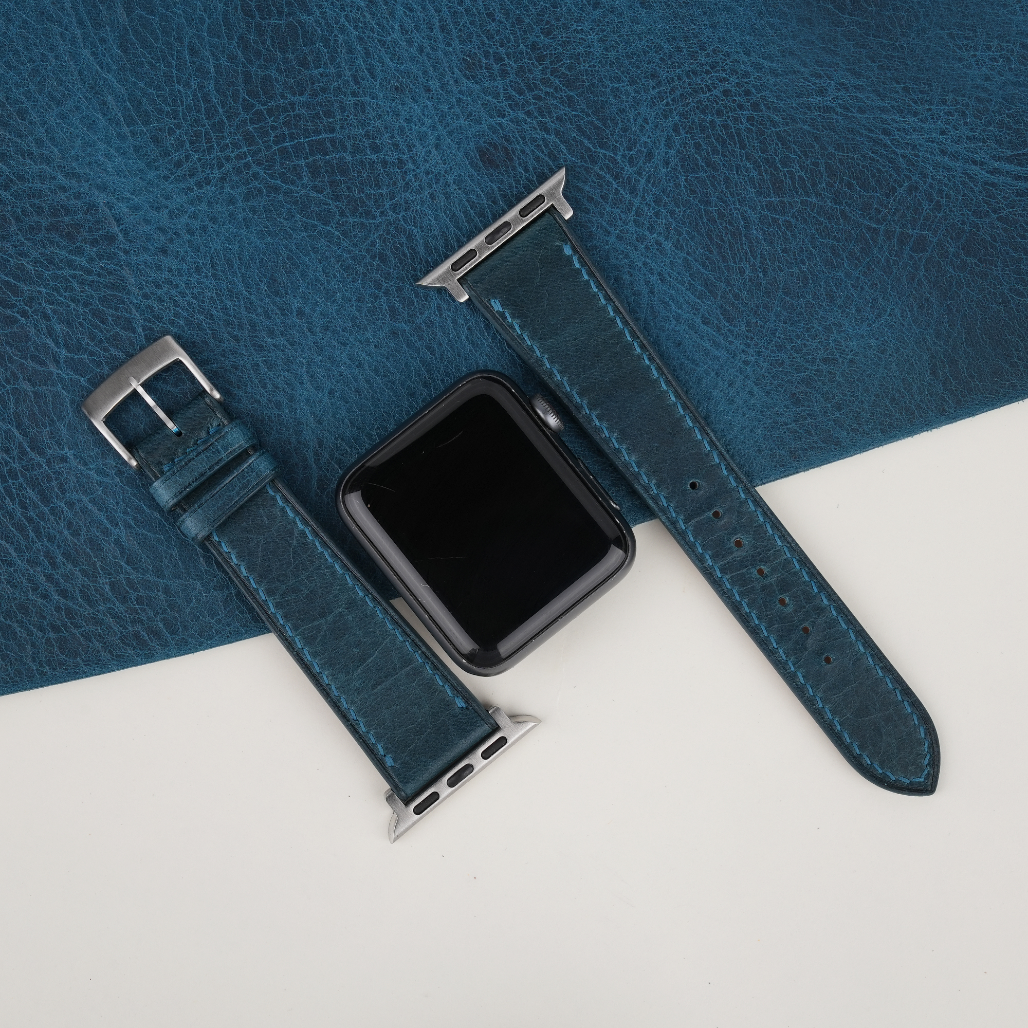 Dark Aqua Blue Waxed Badalassi Carlo Leather Apple Watch Band (Slim Style) 100% handmade custom straps by Vietnamese craftsmen Handdn Watch Bands are compatible with all versions of Apple Watch, including Series 8, 7, 6, SE, 5, 4, 3, 2, and 1.
