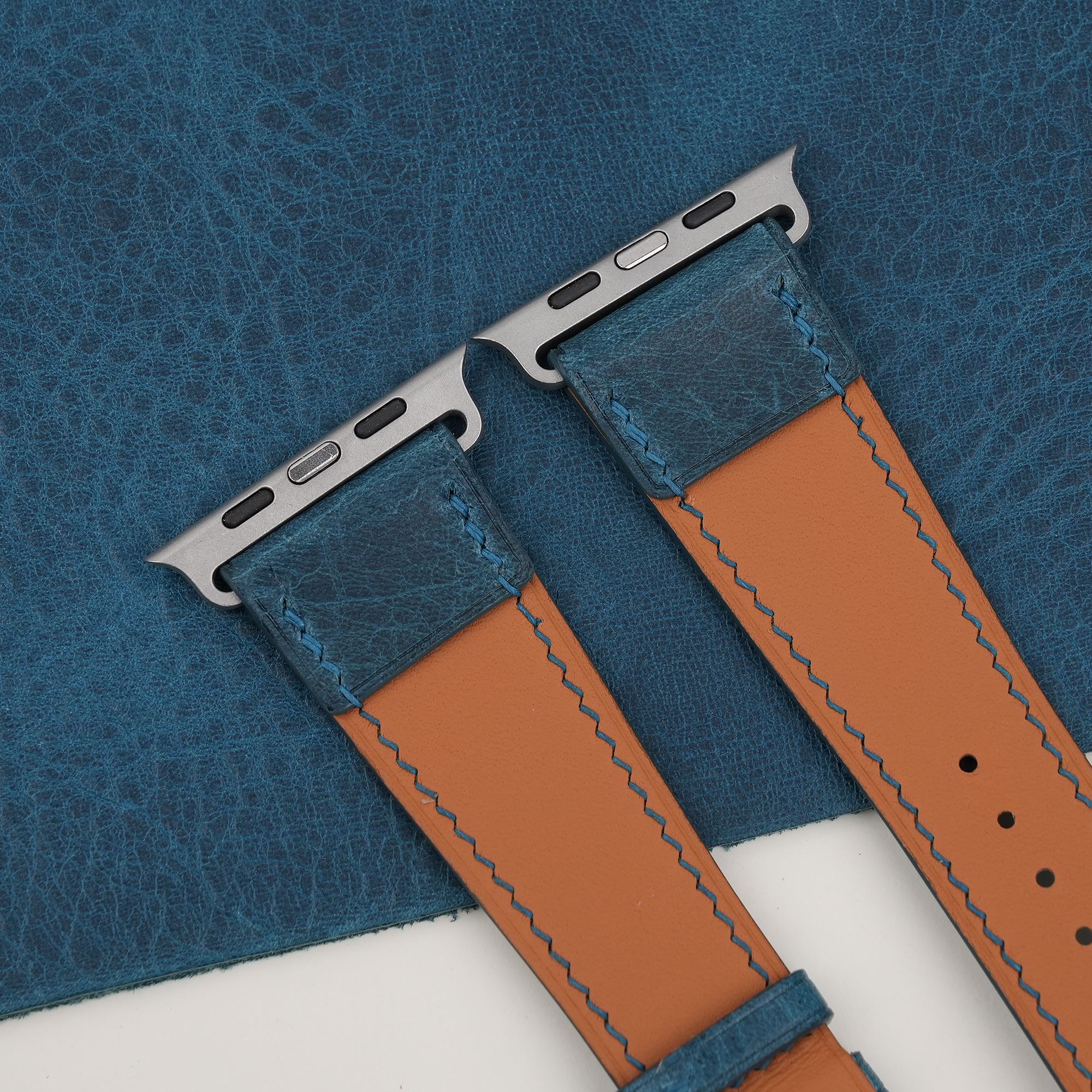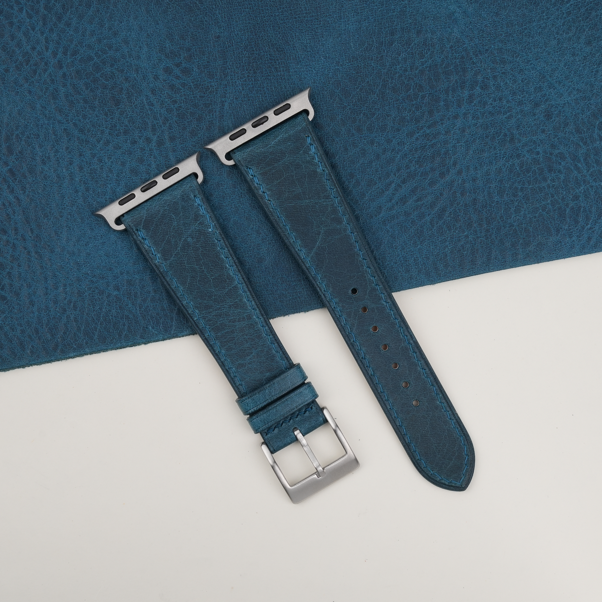 Dark Aqua Blue Waxed Badalassi Carlo Leather Apple Watch Ultra Band 100% handmade custom straps by Vietnamese craftsmen Handdn Watch Bands are compatible with Apple Watch Ultra.