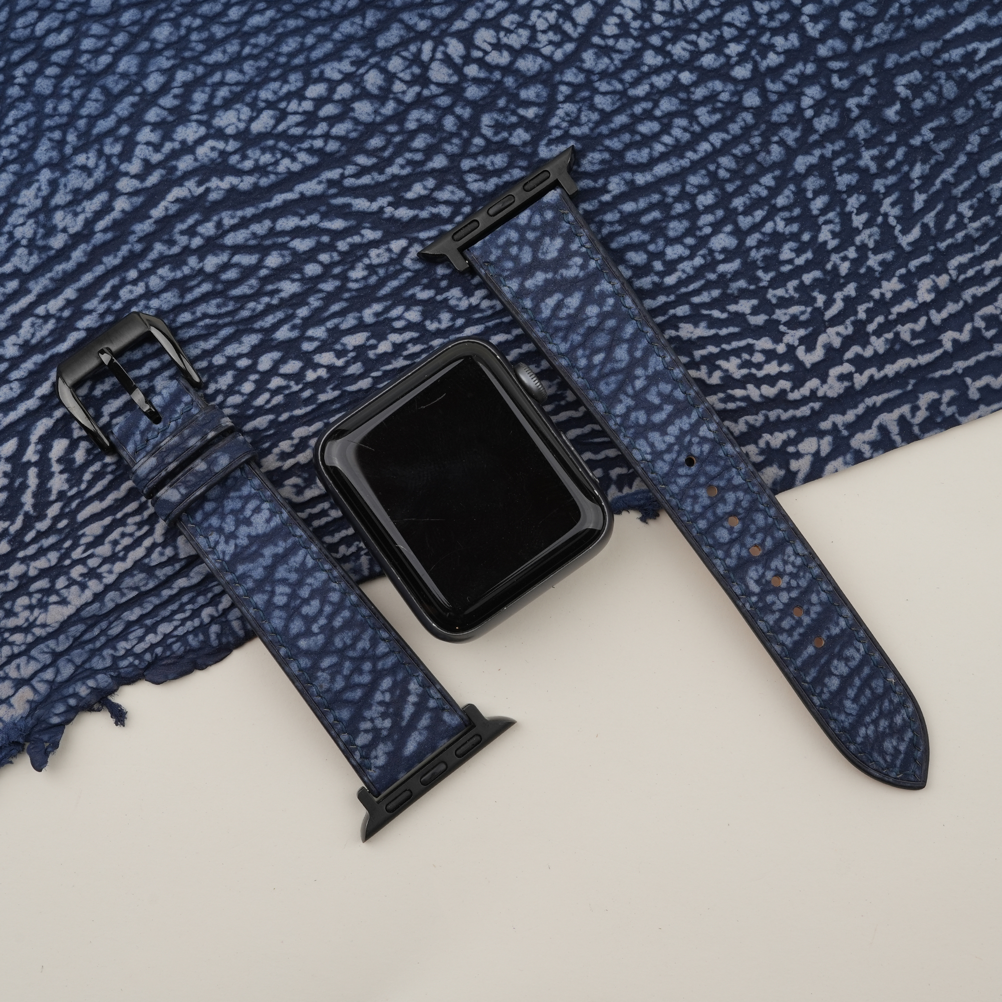 Dark Blue Shark Leather Apple Watch Band 100% handmade custom straps by Vietnamese craftsmen Handdn Watch Bands are compatible with all versions of Apple Watch, including Series 8, 7, 6, SE, 5, 4, 3, 2, and 1.