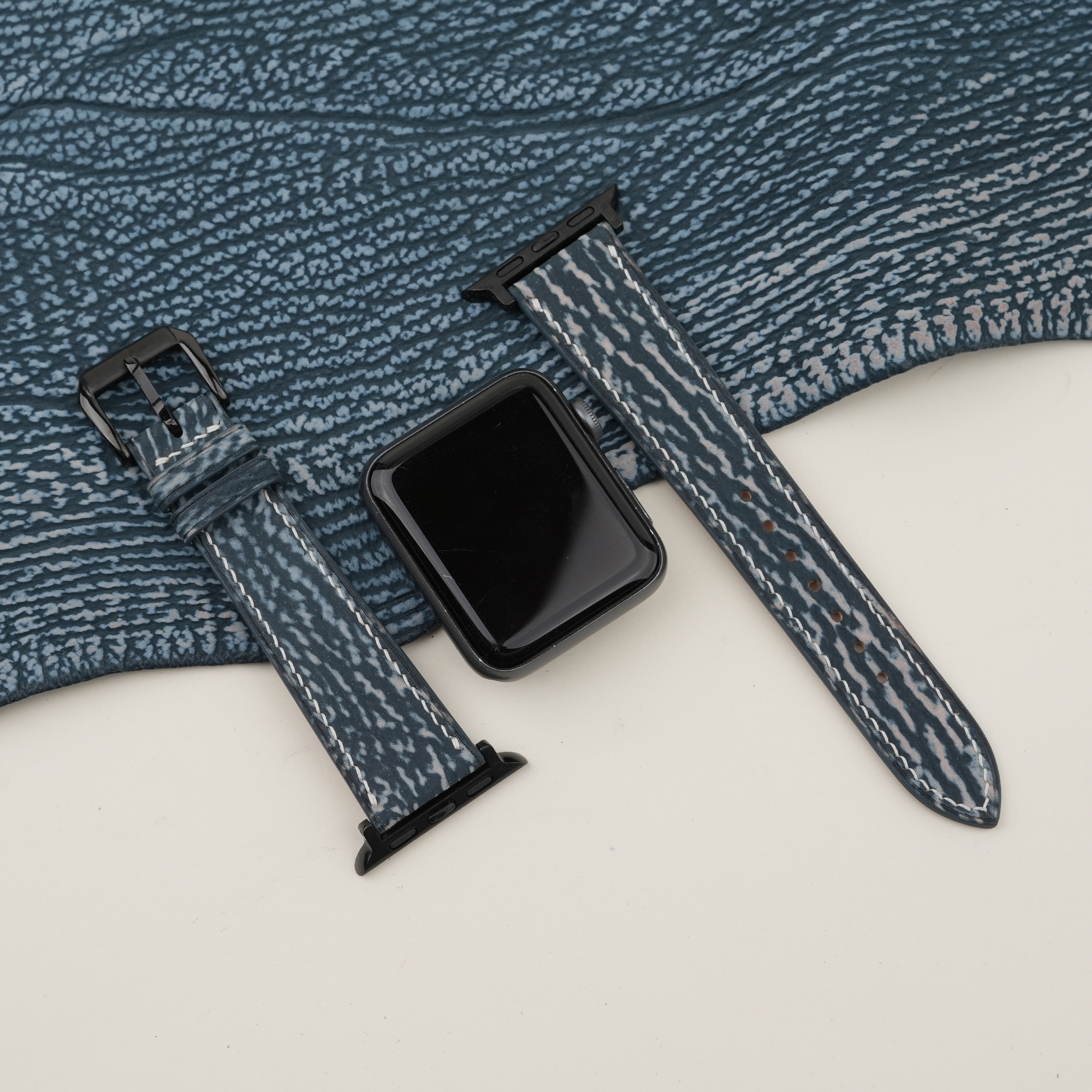 Structure of a Jean Blue Shark Leather Apple Watch Band: Shark Leather main face, water-resistant and soft Zermatt specialized lining, absolute anti-irritant, Velodon specialized reinforced material (SH-220 reinforcement).