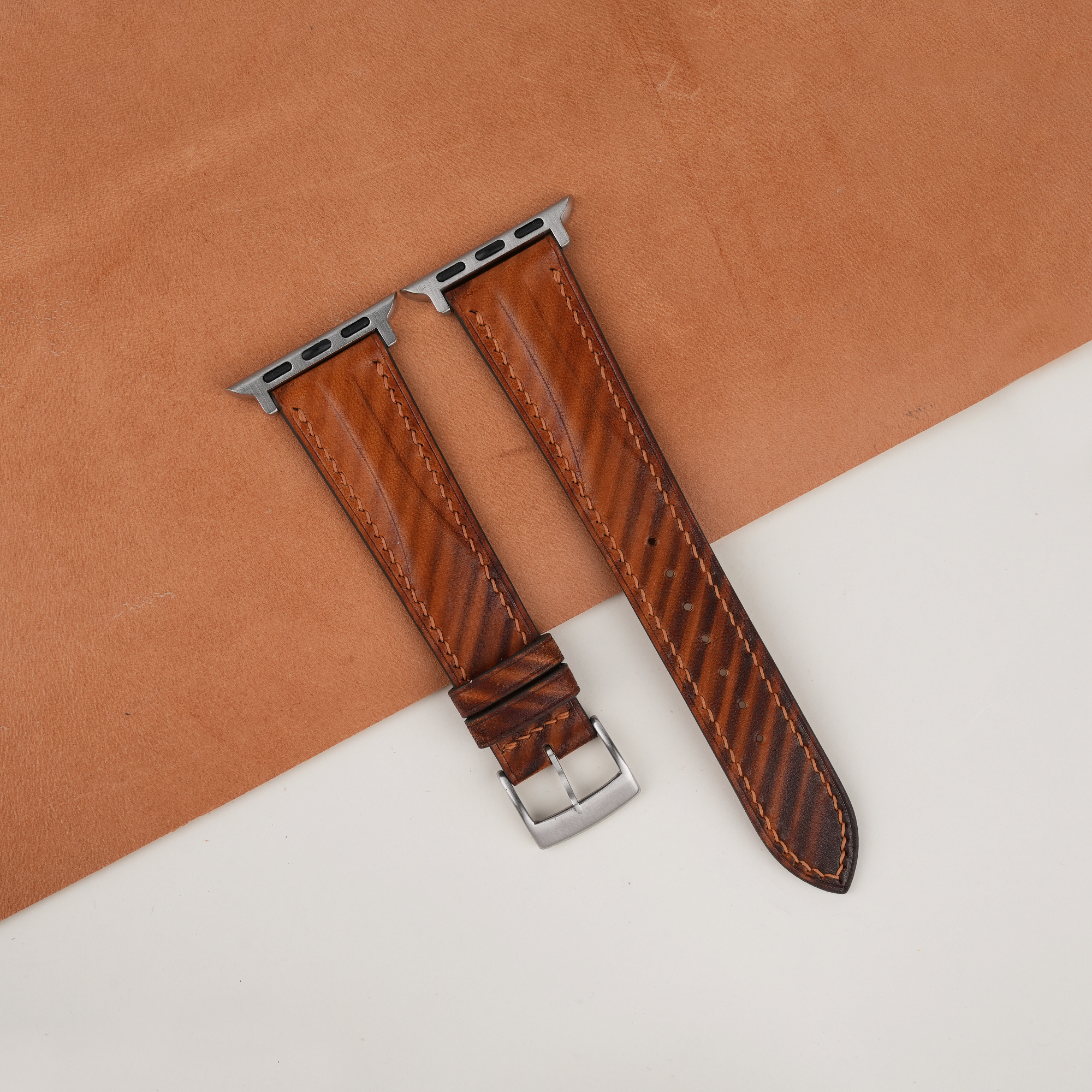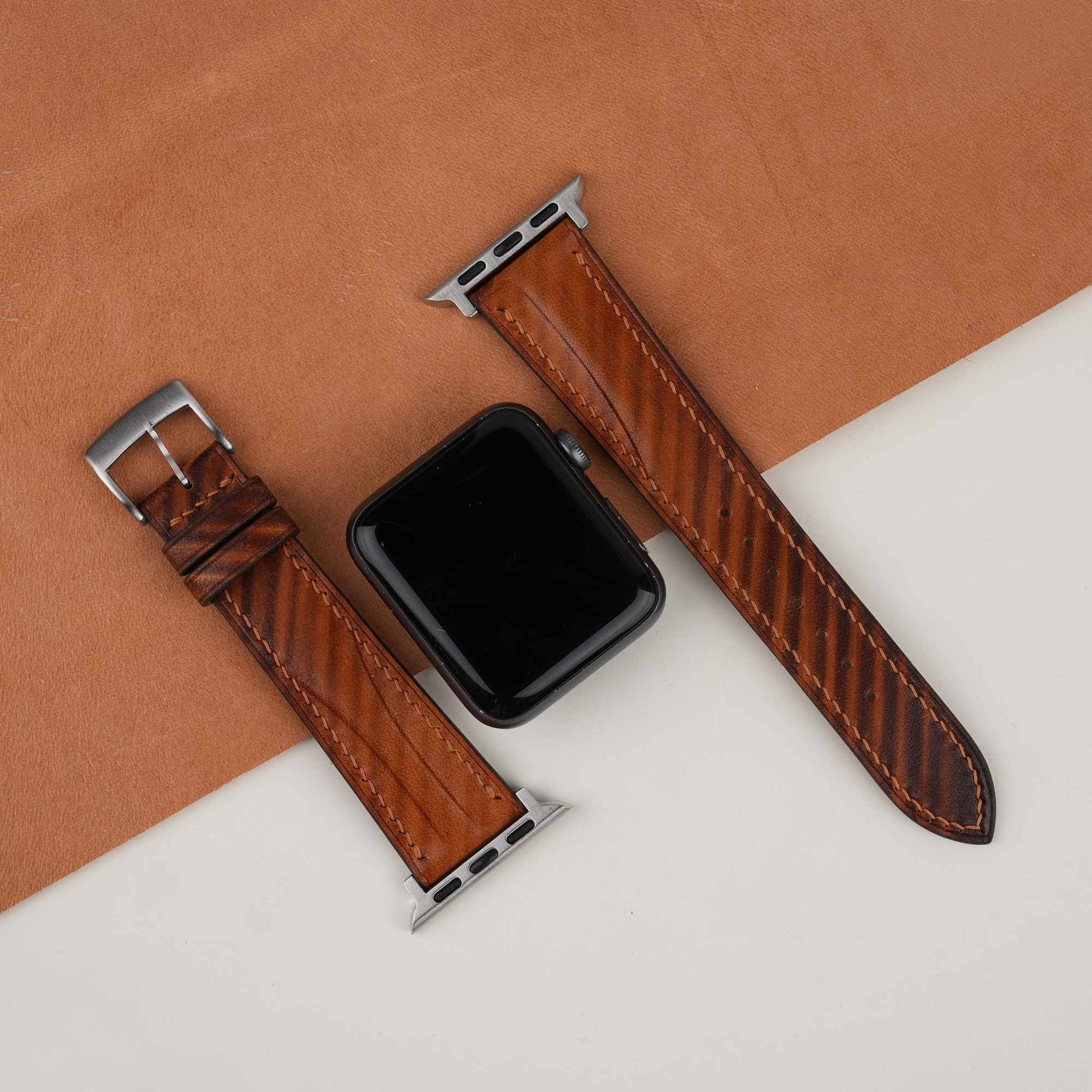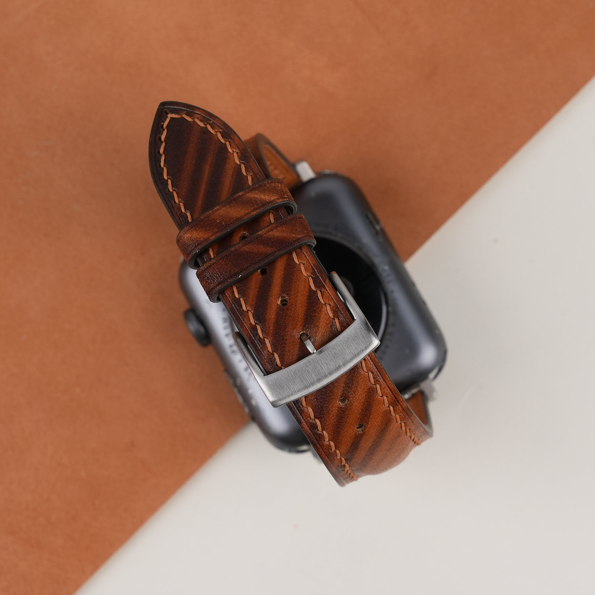 Patina Brown Slash Vachetta Leather Apple Watch Band (Slim Style) 100% handmade custom straps by Vietnamese craftsmen Handdn Watch Bands are compatible with all versions of Apple Watch, including Series 8, 7, 6, SE, 5, 4, 3, 2, and 1.