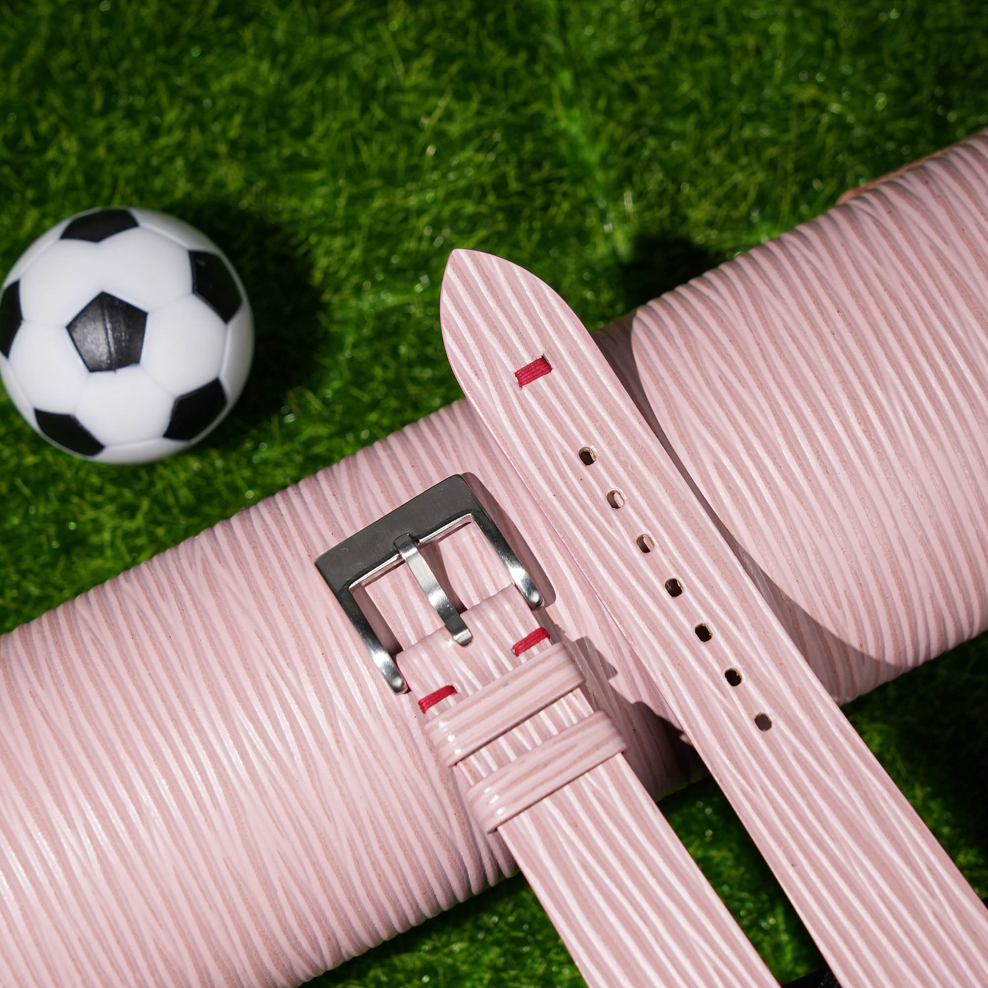 Structure of Pink Calfskin Leather France Flag Watch Strap: Epi Leather main face (waves pattern), water-resistant and soft Zermatt specialized lining, absolute anti-irritant, Velodon specialized reinforced material (SH-220 reinforcement).