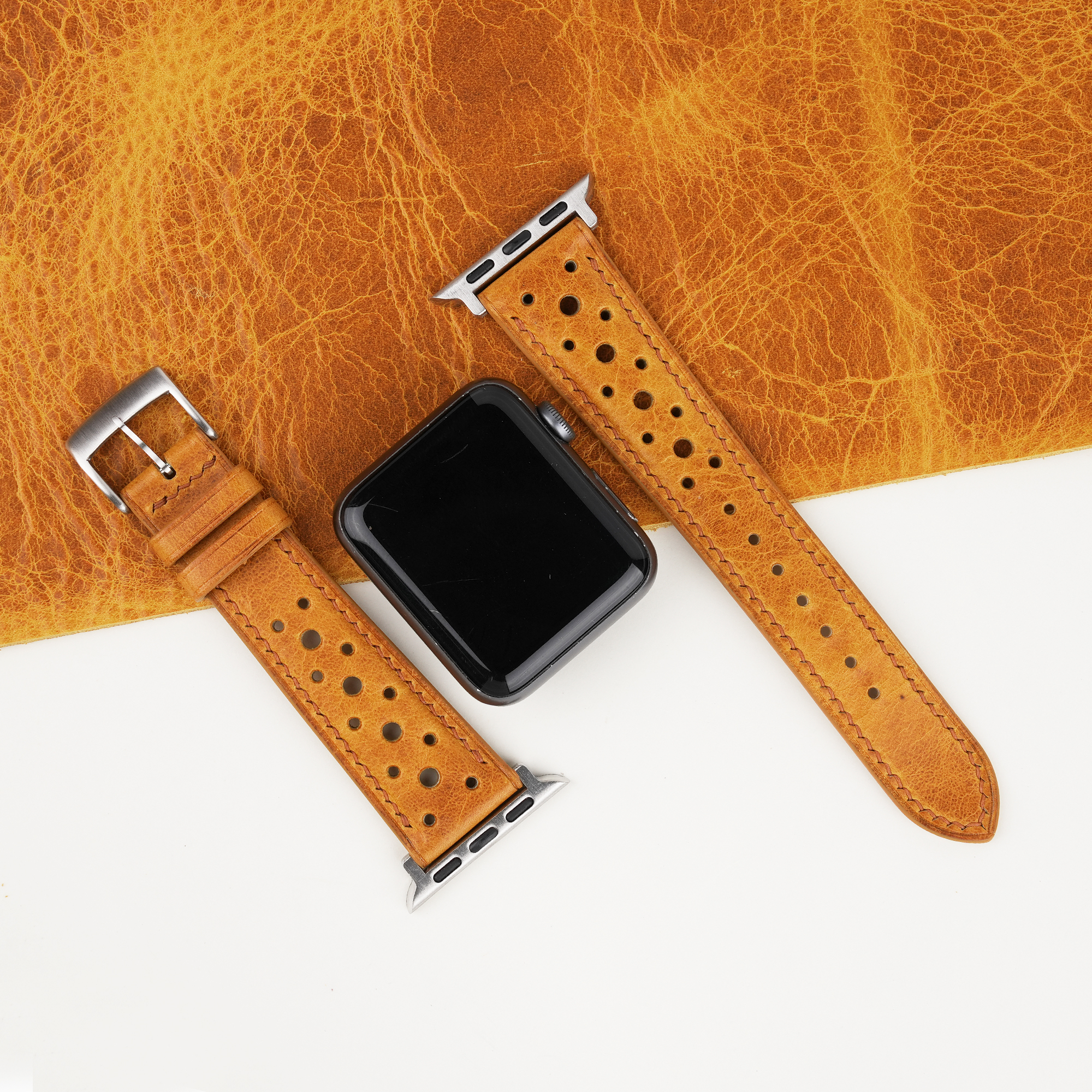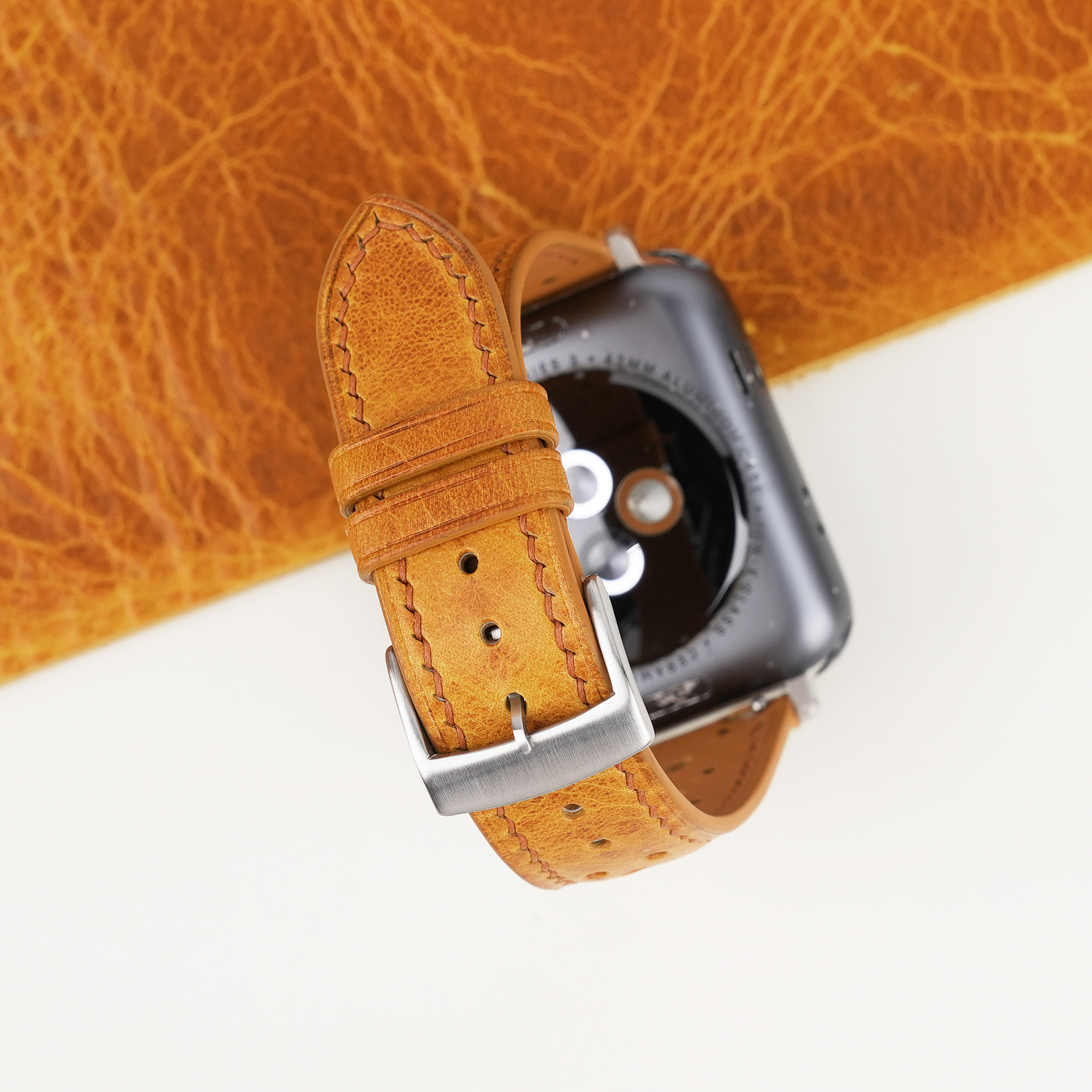Rally Whiskey Waxed Badalassi Carlo Leather Apple Watch Band 100% handmade custom straps by Vietnamese craftsmen Handdn Watch Bands are compatible with all versions of Apple Watch, including Series 8, 7, 6, SE, 5, 4, 3, 2, and 1.