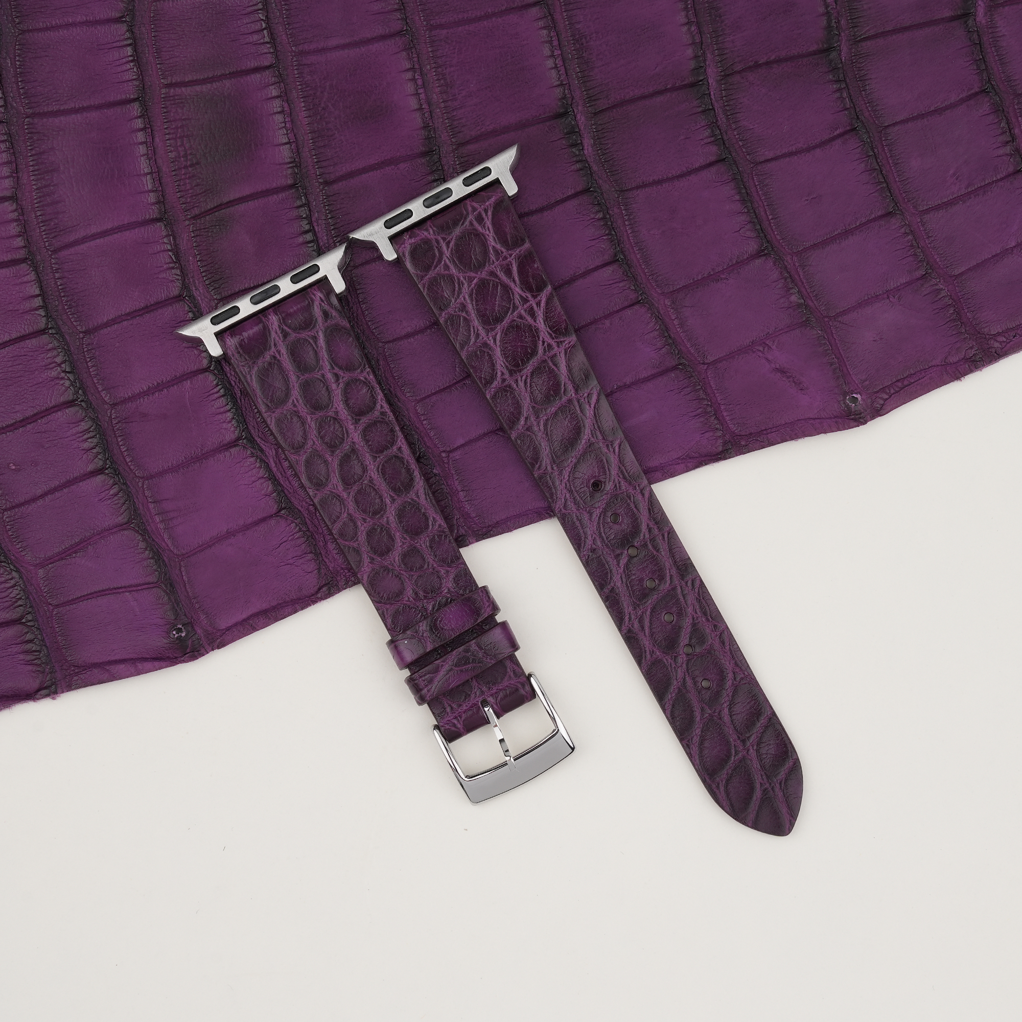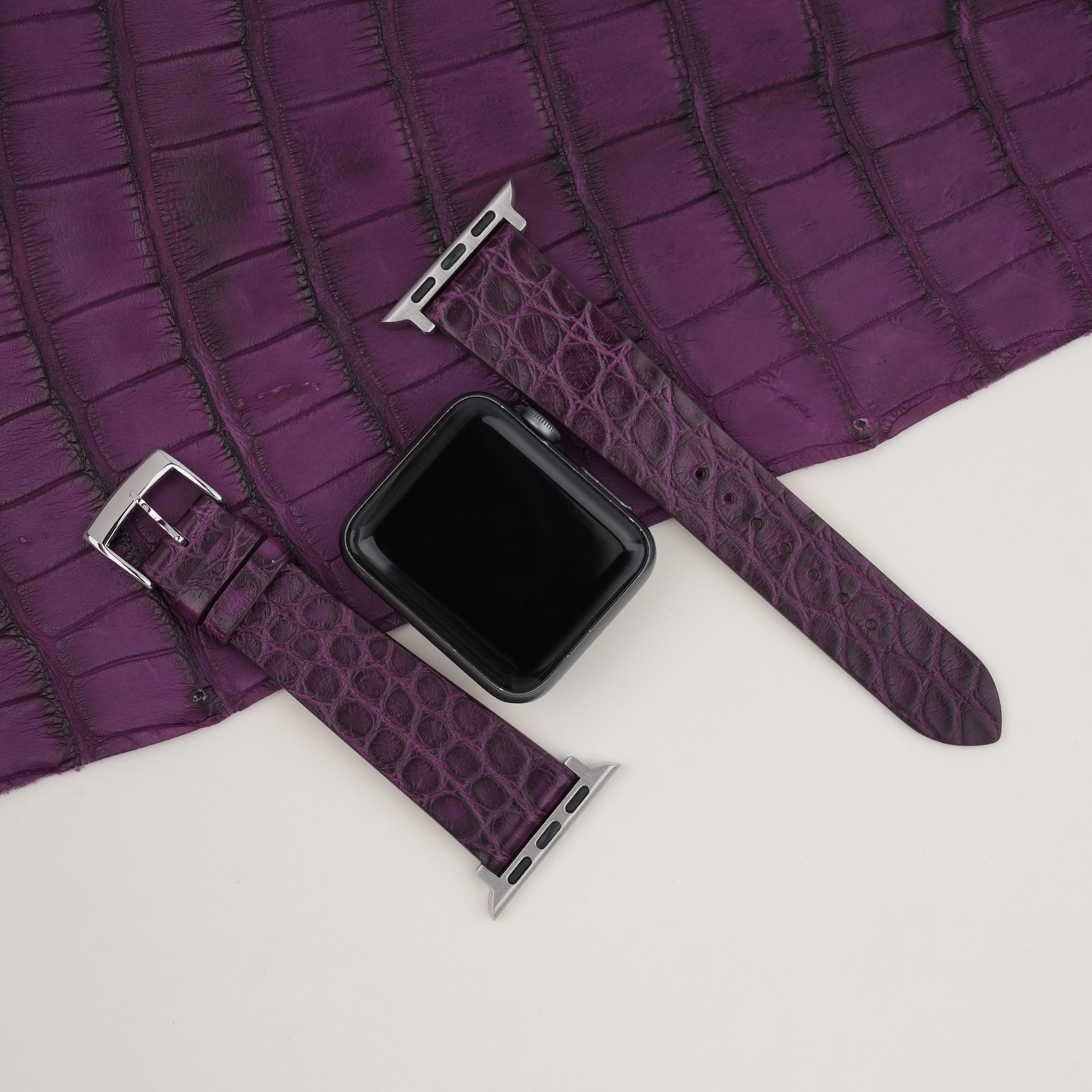 Vintage Purple Round Scales Alligator Leather Apple Watch Band (Slim Style) 100% handmade custom straps by Vietnamese craftsmen Handdn Watch Bands are compatible with all versions of Apple Watch, including Series 8, 7, 6, SE, 5, 4, 3, 2, and 1.